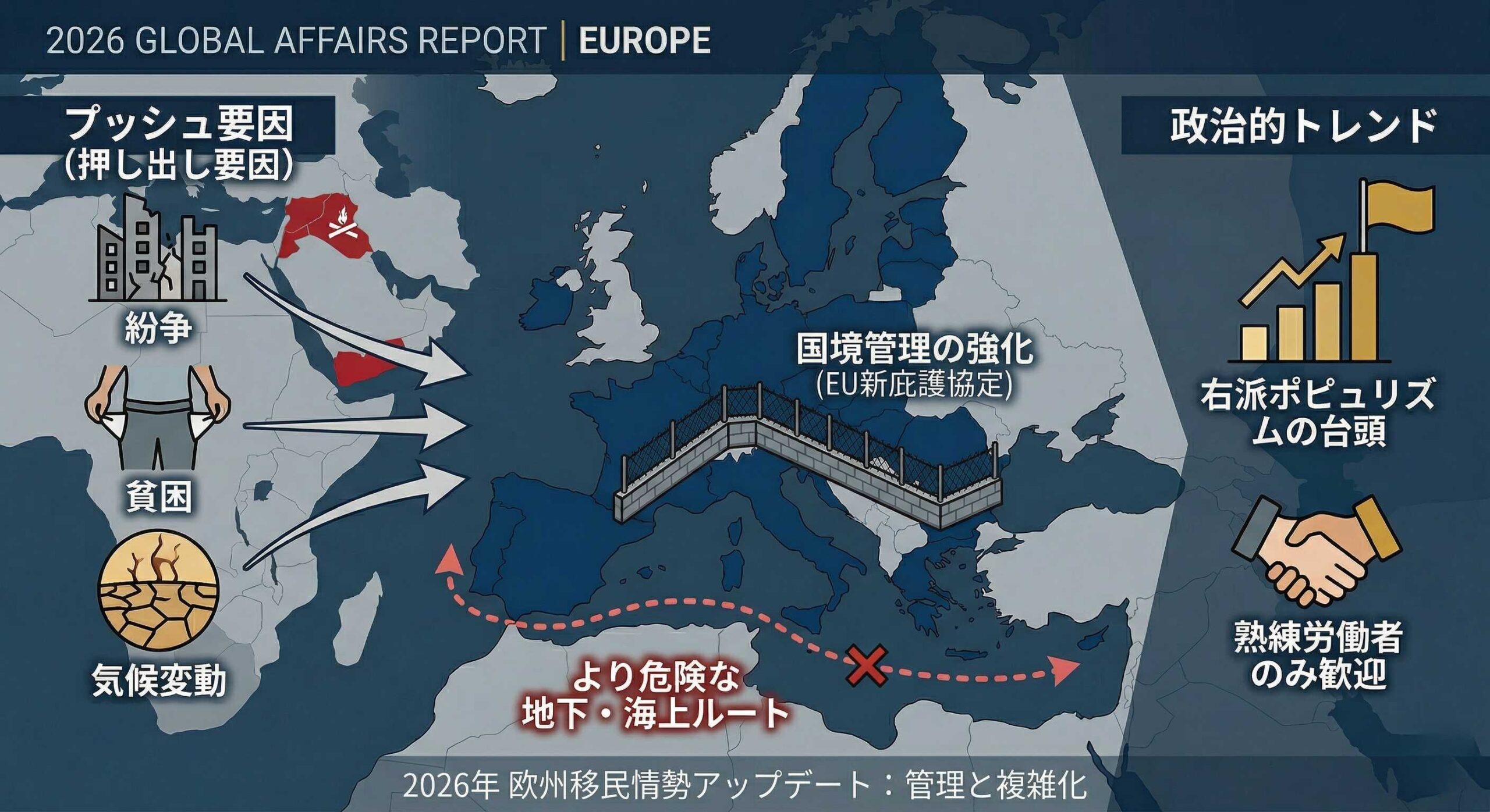 2026年6月から新移民庇護協定が全面適用予定。不法入国者の迅速なスクリーニング・強制送還・北アフリカ諸国との国境管理協定が柱。