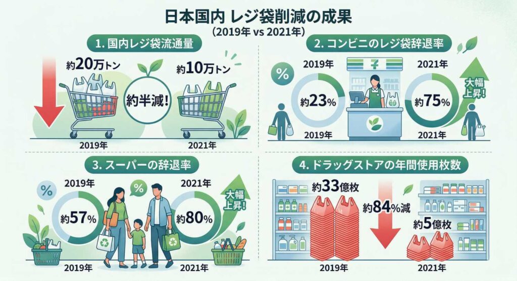 - 国内レジ袋流通量:約20万トン(2019年)→ 約10万トン(2021年)と約半減
