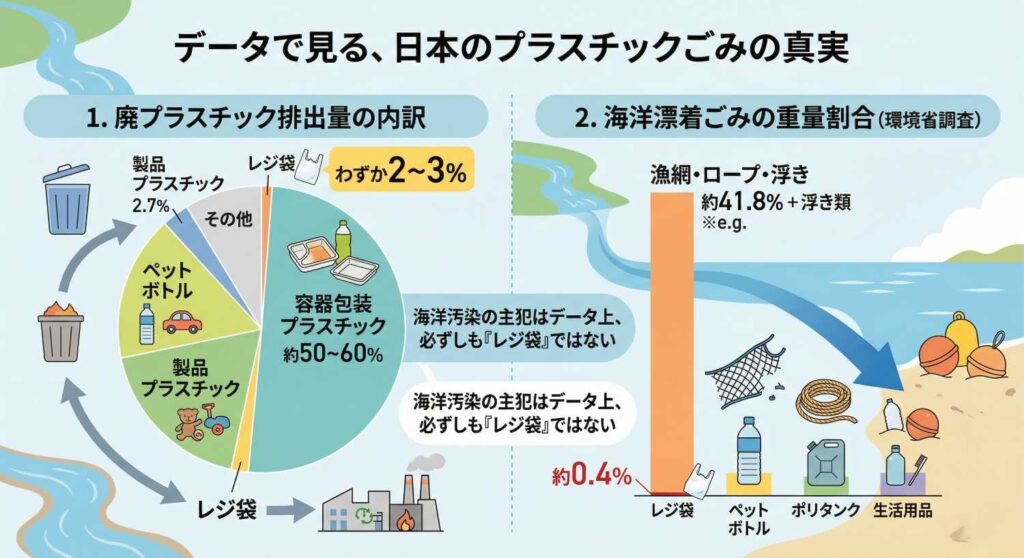 日本で排出されるプラスチックごみのうち、レジ袋が占める割合はわずか2〜3%程度とされている。環境省の発表では、漂流プラスチックごみのうちレジ袋が占める重量割合はさらに低く、約0.4%にとどまるというデータもある。漂流ごみの大半は漁網・ロープ(約41.8%)や浮きなどが占めており、「レジ袋が海洋汚染の主犯」という図式は、データ上は必ずしも正確ではないという指摘がある。
