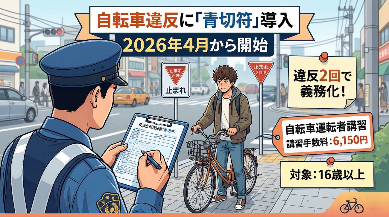2026年4月1日より、16歳以上の自転車利用者に対して、交通違反の際に反則金を納付させる「交通反則通告制度(いわゆる青切符)」が適用されることが決まりました。これまで自転車の違反は、刑事罰の対象となる「赤切符」か、法的拘束力のない「指導(イエローカード)」に限られていましたが、今後は自動車と同様に迅速な行政処分が行われることになります。本改正により、信号無視や一時不停止といった日常的な違反に対しても、数千円規模の反則金が課される見通しです。