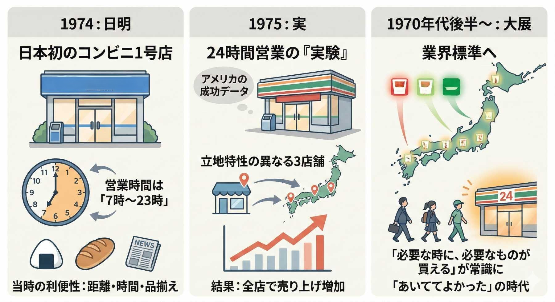 | 24時間営業の始まり(1975年) | アメリカの成功データをもとにした3店舗の実験導入 |