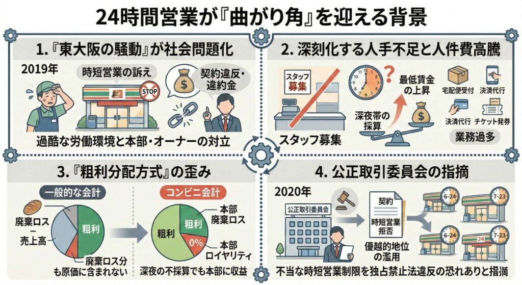 | 見直しの主な背景 | 労働力不足・人件費高騰・本部と加盟店の利害不一致・公正取引委員会の指摘 |