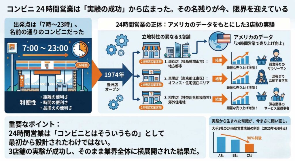 24時間営業は、コンビニという業態の本質として最初から設計されたわけではない。1975年の3店舗実験が成功し、その結果を業界全体に横展開した運用モデルだ。