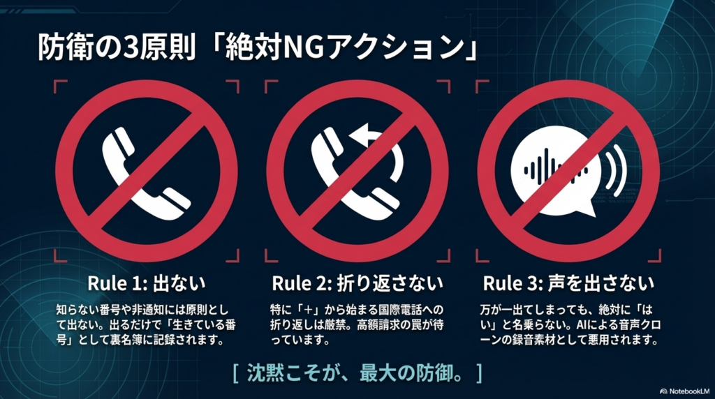 • 知らない番号・非通知には出ない:これが最も効果的な防御とされている