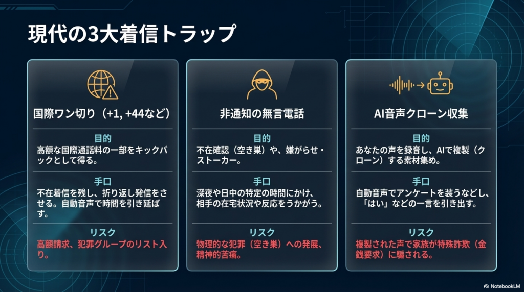 非通知・ワン切り電話は、一見すると単なる迷惑行為に見えるが、その背後には「情報収集→リスト転売→詐欺実行」という一連の構造が存在するという指摘がある。端末とキャリアの設定を組み合わせた「物理的な遮断」が、現時点で最も有効な自己防衛策とされている。